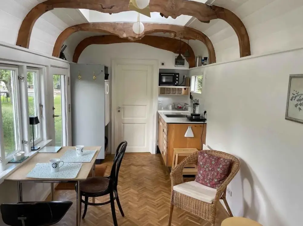Hyggelig indkvartering med meget flot og selektiv indretning. Værten havde brugt tid, energi og penge på at gøre det hyggeligt og pænt. Værtparret var meget flot i løbet af det lille, mens vi så dem, så det var ikke så synligt at bo på nogens plot. Der er en lille ryg, hvor gennemsigtigheden er lidt mindre med grillfaciliteter og aften sol.